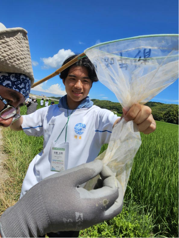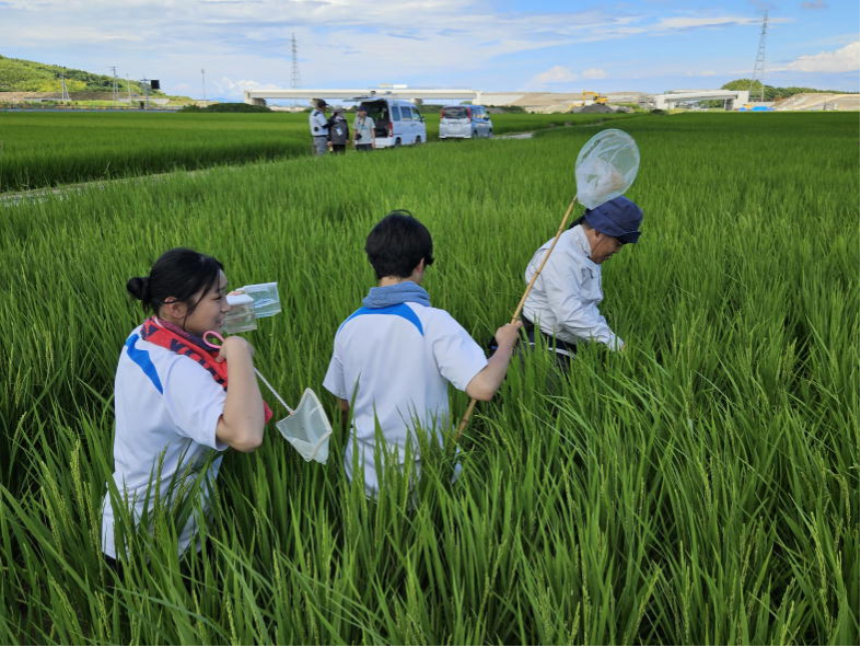 (1)昨年度に引き続き、4名の食物科の生徒が「生物多様性農業をフィールドから考える講座」に参加し、水田の生き物調査などを行いました。7月12日(土)13日(日)にサウンドハウスホールで行われた「第7回生物の多様性を育む農業国際会議(ICEBA7)」では、小松島市の圃場における生きもの調査に参加し、1日目に生き物調査の現地中継にも参加しました。